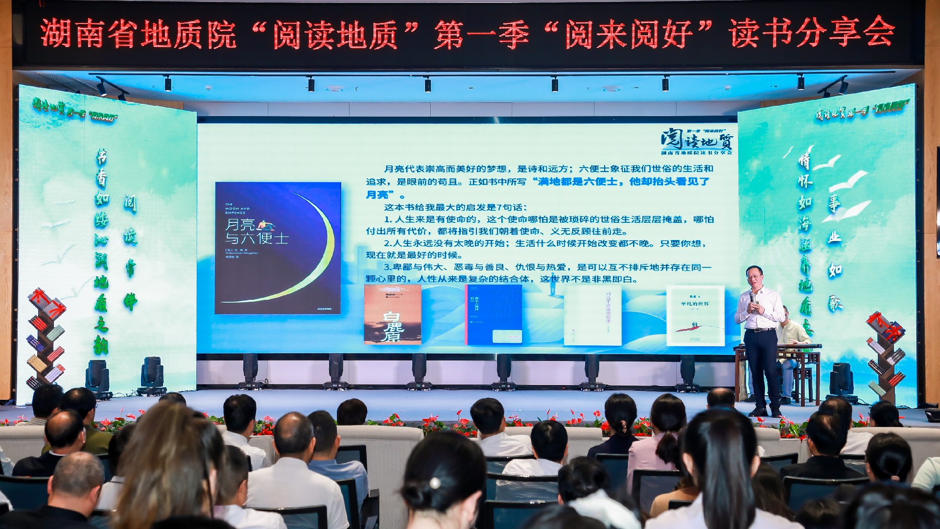 “腳步夠不到的地方,書籍可以;眼睛看不到的地方,書籍可以”“《習(xí)近平講黨史故事》是2023年3月我在中央黨校學(xué)習(xí)期間讀完的,我還從‘銘記一輩子、回味一輩子、受益一輩子、激勵(lì)一輩子、奮進(jìn)一輩子’在中央黨校讀書分享會上談了感受”“《月亮與六便士》是我這次到深圳出差期間讀完的,起初我不理解書名,直到看完書才深刻領(lǐng)會其中旨意”……現(xiàn)場,伴著古琴聲聲,談文勝以“讓閱讀點(diǎn)亮地質(zhì)未來”為題,結(jié)合自身讀書經(jīng)歷和所感所悟,為大家傾情推薦五本書;并從不求完美的閱讀場景、不求完好的閱讀體驗(yàn)、不求完滿的閱讀結(jié)果、不求完整的閱讀體系等方面,勉勵(lì)全院干部職工學(xué)習(xí)習(xí)近平總書記“一物不知,深以為恥,便求知若渴”的讀書態(tài)度,珍惜閱讀機(jī)會,用心感受書籍帶來的智慧與力量。