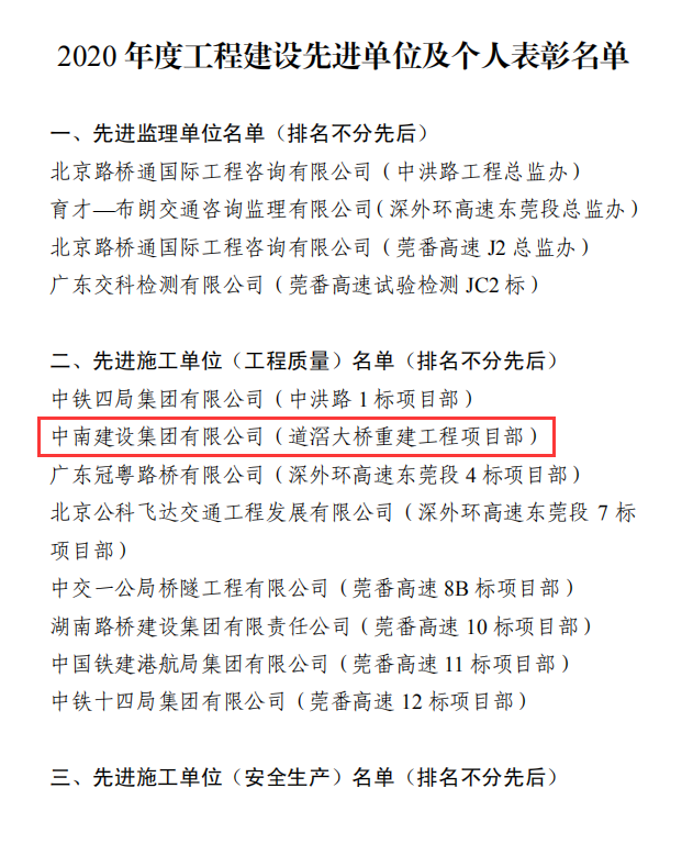中南建設(shè)集團(tuán)有限公司(道滘大橋重建工程項(xiàng)目部)被評(píng)為先進(jìn)施工單位,劉付豐被評(píng)為先進(jìn)個(gè)人。