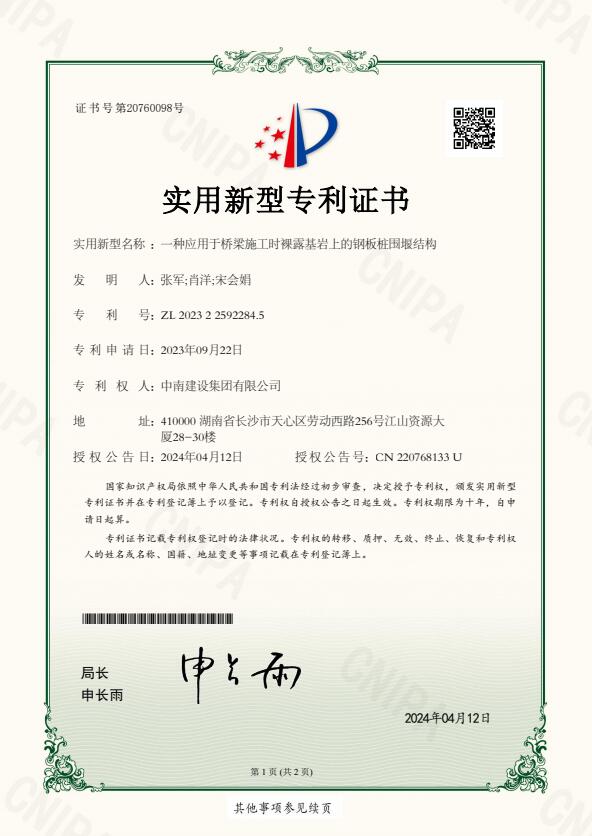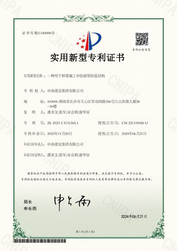 耒陽(yáng)市大河邊渡改橋工程是中南建設(shè)集團(tuán)承建的是湖南省重點(diǎn)旅游公路項(xiàng)目。自開(kāi)工以來(lái),公司高度重視,集中優(yōu)秀人才和優(yōu)質(zhì)資源,不斷攻克施工難題,加強(qiáng)核心技術(shù)攻關(guān),推動(dòng)科技成果加速轉(zhuǎn)化,加快形成新質(zhì)生產(chǎn)力。4月,公司獲得國(guó)家知識(shí)產(chǎn)權(quán)局頒發(fā)的《一種應(yīng)用于橋梁施工時(shí)裸露基巖上的鋼板樁圍堰結(jié)構(gòu)》實(shí)用新型專(zhuān)利。近日,再獲《一種用于橋梁施工中的新型掛籃結(jié)構(gòu)》實(shí)用新型專(zhuān)利。兩項(xiàng)成果的獲得,既增強(qiáng)了公司在路橋領(lǐng)域的建設(shè)實(shí)力,提振了大家的信心,也為整個(gè)行業(yè)的科技進(jìn)步貢獻(xiàn)了中南智慧和中南力量。