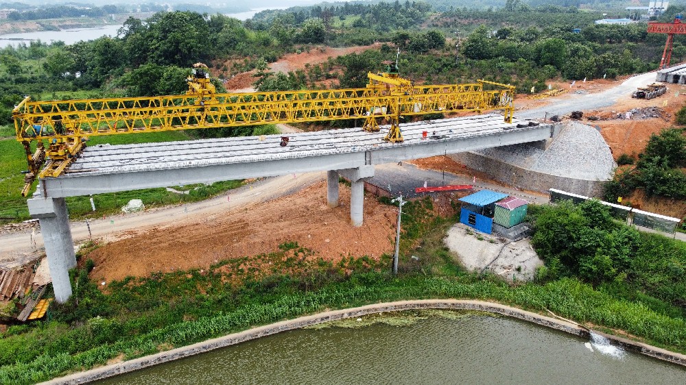 中南建設(shè)集團耒陽市大河邊渡改橋工程首片預(yù)制T梁成功架設(shè)